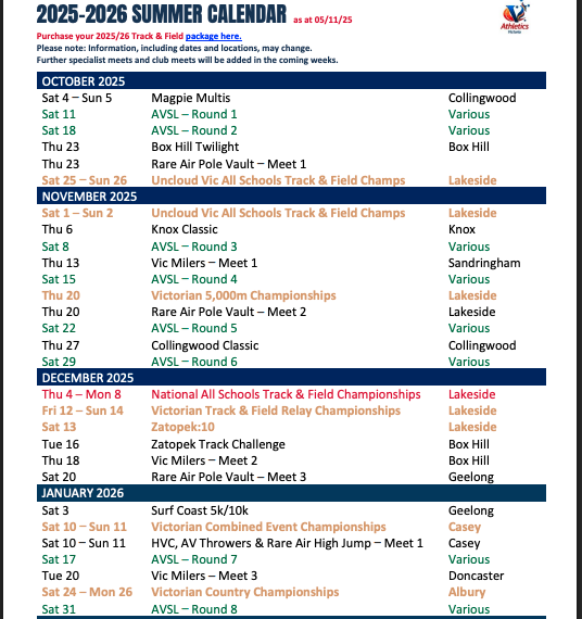We compete in road races and cross country events over winter and track and field events over summer - including sprints, middle distance, relays, high jump, pole vault, long jump, triple jump, javelin, shot put, discus and hammer.
